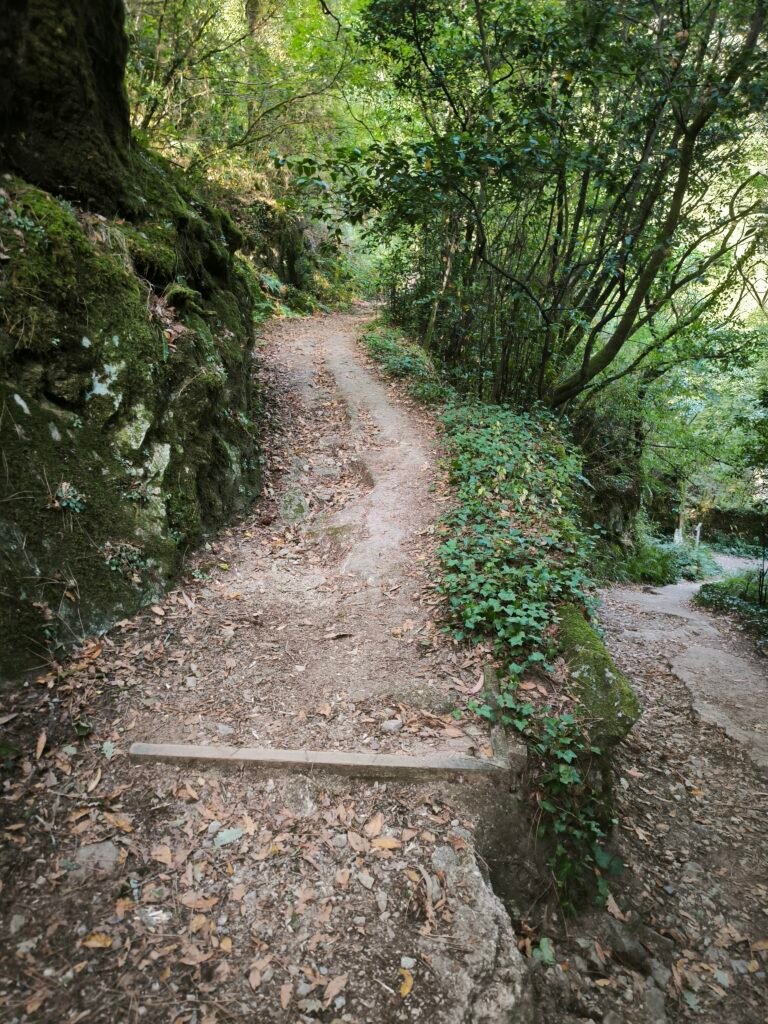 Tras atravesar cualquier puente y un arco de piedra a continuación, tenemos un primer camino a la izquierda que desciende a una pequeña presa del río. Por el camino de la derecha, todo recto, llegaremos hacia la Fervenza. Un camino que sale poco más adelante hacia atrás será la ruta que debamos tomar después de las vistas del Belelle.