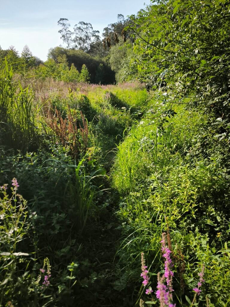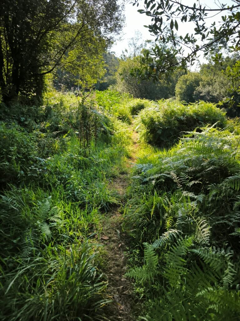 Tras cruzar esta pasarela hacia la derecha, abandonaremos el camino ancho que estamos siguiendo y tomaremos un sendero estrecho. Es probable que durante algunos tramos pueda quedar poco definido si la vegetación es muy densa. En ese caso, es posible continuar por la carretera paralela sin perder de vista el camino, aunque nos perdemos el encanto del sendero junto al río.
